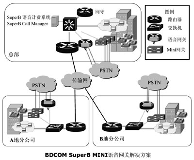根據(jù)西北石油公司各地分公司電話全部是PSTN直線電話,沒有單位內(nèi)部的PBX,不能通過語音網(wǎng)關把這些直線電話統(tǒng)一接入到IP網(wǎng)絡上這一實際情況,方案提供方博達公司提供了一款小型BDCOM SuperB Mini語音網(wǎng)關,來解決PSTN程控電話統(tǒng)一接入IP語音網(wǎng)絡的問題。使用BDCOM SuperB Mini并結合西北石油公司組建的企業(yè)內(nèi)部VoIP網(wǎng)絡,克服了傳統(tǒng)語音網(wǎng)關解決方案的不足和缺點。