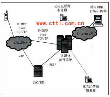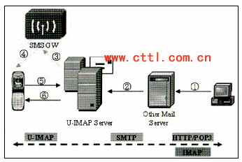 互聯(lián)網郵箱到聯(lián)通U-IMAP手機終端業(yè)務支持互聯(lián)網郵件用戶直接向手機終端用戶發(fā)送郵件,需要郵件服務器、U-IMAP Server以及移動手機終端的支持,根據(jù)實際情況,有時還需要短信中心的支持,用于向移動手機終端發(fā)送郵件到達的通知。郵件服務器與U-IMAP Server之間的協(xié)議采用SMTP協(xié)議,U-IMAP