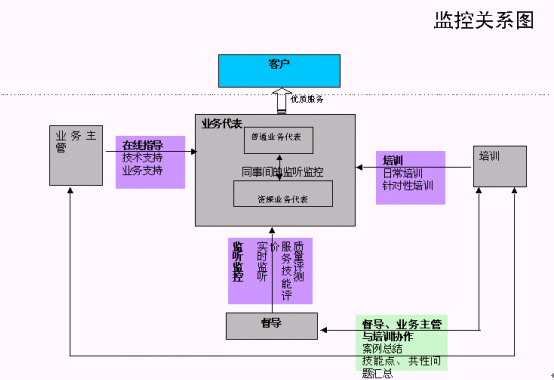 呼叫中心的質(zhì)量管理涉及到如下幾個方面,一、座席人員的話務質(zhì)量;二、各項質(zhì)量運營指標的實現(xiàn)情況;三、客戶的滿意度指標。在本部分內(nèi)容中,重點討論話務人員的話務質(zhì)量控制。