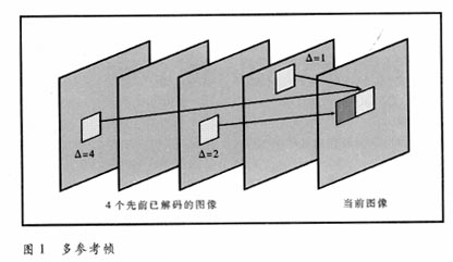 過去,在H.261等標準中,運動補償時只選用前一幀作參考幀。為了進一步提高預測精度,H.264中可選用多至前后5幀的多參考幀(見圖1)。