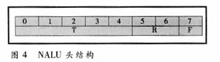 。危粒毯鸵酝鶚藴什煌 H.264中設置NAL層,把一個數據包(采用RTP/RTCP規(guī)程)放在一個NAL單元中,它的句法結構可適用于各種不同網絡,它的頭信息結構見圖4,全長8 bit,其中T為類型,長5 bit,包括32個不同類型的NAL單元;R為2 bit,指示該NAL單元的重要性,分四個等級,用于不同的誤碼保護;F為1 bit,指示該單元是否有誤碼(正常為0,誤碼為1)?梢姡危粒痰木浞ńY構充分考慮到不同網絡環(huán)境下的誤碼保護。