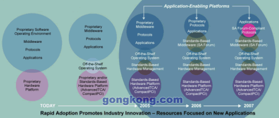 計算機和通信業(yè)已經(jīng)堅定的向開放標準演進。例如,Linux已經(jīng)被作為OS大量采用,計算模塊已經(jīng)遵循各種規(guī)范標準來設計,具有標準接口,如CPCI和ATCA。如果TEM繼續(xù)采用目前的方法集成計算機硬件和軟件模塊,全面標準化將是一個緩慢延進的過程。下一步將是基于標準的硬件平臺管理,最終可能在本年代末,遵循SAF的中間件及其上運行的應用。