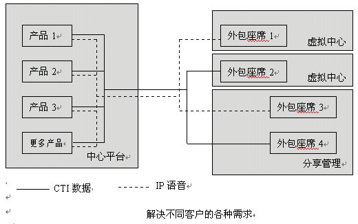 外包中心應(yīng)既能服務(wù)本地業(yè)務(wù),同時服務(wù)本區(qū)甚至全球業(yè)務(wù),單點(diǎn)互連接主要為降低服務(wù)成本,共享服務(wù)資源。單點(diǎn)中心應(yīng)具備靈活的組網(wǎng)方式,可管理客戶現(xiàn)有平臺,并具備高質(zhì)量座席向客戶提供高質(zhì)量的高端服務(wù),同時又有解決普通客戶服務(wù)的一般座席,向客戶提供低價位的公眾服務(wù),如下圖示意: