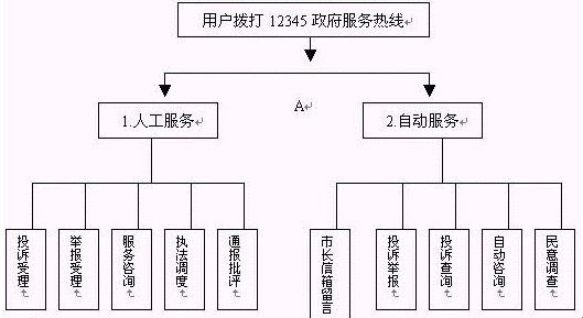當(dāng)用戶(hù)撥通"12345"電話(huà)并選擇自動(dòng)服務(wù)時(shí),聲訊臺(tái)自動(dòng)播放引導(dǎo)語(yǔ)"選擇市長(zhǎng)信箱留言請(qǐng)按1,自動(dòng)投訴舉報(bào)請(qǐng)按2,投訴查詢(xún)請(qǐng)按3,服務(wù)咨詢(xún)請(qǐng)按4,民意調(diào)查請(qǐng)按5。