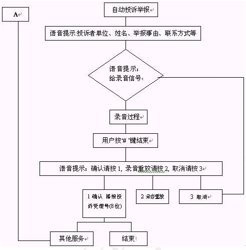 群眾通過(guò)自動(dòng)臺(tái)按照語(yǔ)音提示進(jìn)行投訴、舉報(bào)選擇錄音。自動(dòng)投訴舉報(bào)錄音流程如下: