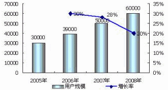 2006年1月?lián)Z盛發(fā)布的最新《2005-2006年移動(dòng)增值業(yè)務(wù)市場(chǎng)回顧與展望》報(bào)告數(shù)據(jù)顯示,2005年中國(guó)的移動(dòng)增值業(yè)務(wù)用戶規(guī)?倲(shù)達(dá)到了3億,市場(chǎng)規(guī)模達(dá)到近近4588億元。諾盛預(yù)計(jì),2006年移動(dòng)增值業(yè)務(wù)用戶規(guī)模將達(dá)到3.9億,市場(chǎng)規(guī)模為620億元;2007年在3G的刺激下,移動(dòng)增值業(yè)務(wù)用戶規(guī)模將達(dá)到5億,市場(chǎng)規(guī)模為810億元;2008年用戶規(guī)模將達(dá)到6億,市場(chǎng)規(guī)模為1053億。移動(dòng)增值業(yè)務(wù)用戶規(guī)模年增長(zhǎng)率在20%以上,市場(chǎng)規(guī)模增長(zhǎng)率在30%以上。