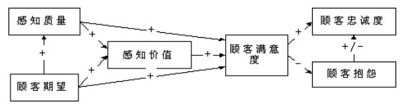 該模型是由六個隱變量組成的因果模型,其中顧客滿意度是最終要求的目標(biāo)變量,感知質(zhì)量、感知價值和顧客期望是因變量,而顧客忠誠度和顧客抱怨則是顧客滿意與否的結(jié)果變量。
