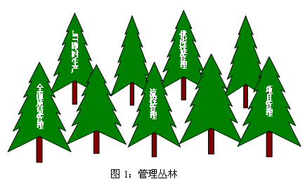 用“叢林”一詞來形容目前管理方法的林立,并沒有夸張的成份。在這片叢林中,許許多多根深葉茂的“參天大樹”不斷產生。許多專家學者把注意力集中于管理的某一方面,如質量管理、流程再造、項目管理、供應鏈管理等都體現(xiàn)了不同的管理視角。不同管理方法在理論緣由上相互促進、相互影響,他們以各自不同的方式和視角描繪了管理的不同側面。