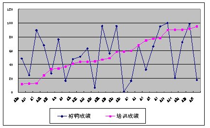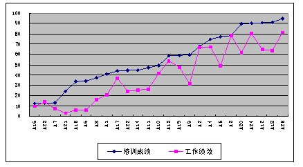 我們通過分析,圖3顯示,員工的培訓(xùn)成績和其工作績效是無關(guān)的,這說明培訓(xùn)是無效的。無效的原因也許是由于培訓(xùn)內(nèi)容不合理或培訓(xùn)組織實(shí)施不善等原因,總之培訓(xùn)是無效的,需要改進(jìn)。