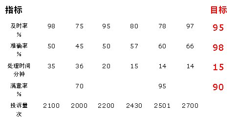 從滿意度的角度來看:5月份的指標(biāo)值已達(dá)到目標(biāo)值95%的要求,但只統(tǒng)計(jì)了2月份和5月份兩個月的數(shù)據(jù),數(shù)據(jù)收集不完整,因此,我們對該指標(biāo)無法評價(一般認(rèn)為對三個以下的數(shù)據(jù)無法做出評價)。