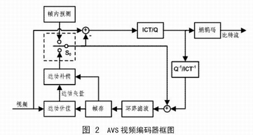 AVS視頻標準定義了I幀、P幀和B幀三種不同類型的圖像,I幀中的宏塊只進行幀內(nèi)預(yù)測,P幀和B幀的宏塊則需要進行幀內(nèi)預(yù)測或幀間預(yù)測,圖中S0是預(yù)測模式選擇開關(guān)。預(yù)測殘差進行8×8整數(shù)變換(ICT)和量化,然后對量化系數(shù)進行zig-zag掃描(隔行編碼塊使用另一種掃描方式),得到一維排列的量化系數(shù),最后對量化系數(shù)進行熵編碼。AVS視頻標準的變換和量化只需要加減法和移位操作,用16位精度即可完成。
