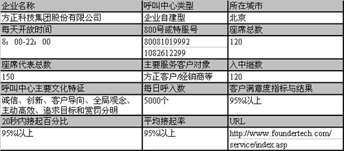 當(dāng)客戶需要得到售后服務(wù)熱線的幫助或技術(shù)服務(wù)時(shí),客戶可通過撥打010-8261299的售后服務(wù)熱線在7*14小時(shí)內(nèi)聯(lián)系工程師。通過客戶關(guān)系管理系統(tǒng),工程師可以方便的了解客戶以前的故障咨詢記錄并解決情況。在這里,客戶不用向不同的工程師描述同樣問題。對(duì)于需要上門解決的問題,呼叫中心工程師會(huì)在故障判斷后生成維修單,安排方正授權(quán)維修站上門服務(wù)。目前方正呼叫中心日處理用戶來電量達(dá)到5000個(gè)左右,同時(shí)網(wǎng)絡(luò)接入客戶不斷上升,這也顯現(xiàn)了呼叫中心網(wǎng)絡(luò)接入的發(fā)展趨勢。