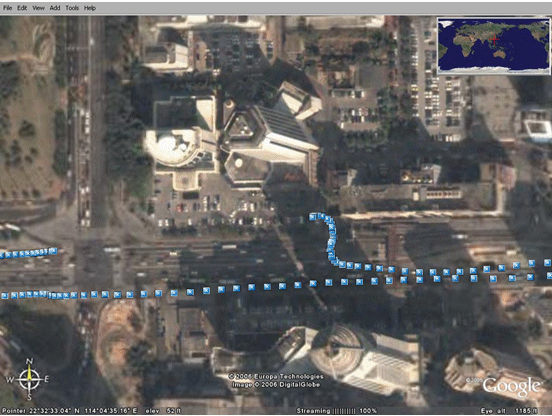 下圖顯示的是在中國深圳市進(jìn)行汽車試駕時(shí)的GPS數(shù)據(jù),利用的是Google earth應(yīng)用程序。圖中的每一個(gè)藍(lán)點(diǎn)代表一個(gè)GPS讀數(shù)。這些點(diǎn)在每隔一秒的時(shí)間內(nèi)讀出,因此,連續(xù)點(diǎn)之間的距離就代表著汽車的速度。我們甚至可以看見汽車駛?cè)氪髽堑耐\噲觥?br />