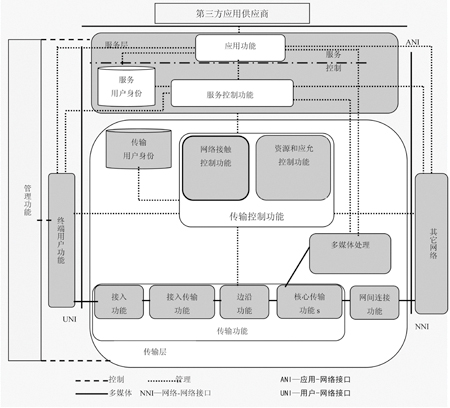 圖2展示了下一代網(wǎng)絡結構。根據(jù)Y.2011建議書,下一代網(wǎng)絡的功能分為服務層和傳輸層。終端用戶功能由用戶-網(wǎng)絡接口(UNI)接到下一代網(wǎng)絡,而其他網(wǎng)絡則通過網(wǎng)絡—網(wǎng)絡接口(NNI)互相連接。