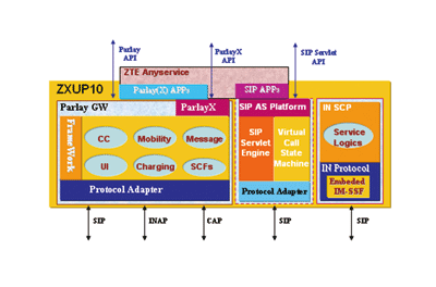 ZXUP10作為開放業(yè)務(wù)平臺(tái),包括Parlay網(wǎng)關(guān)和SIP應(yīng)用平臺(tái),對(duì)外提供標(biāo)準(zhǔn)的Parlay/ParlayXAPI和SIPServletAPI,屏蔽底層網(wǎng)絡(luò)的差異性,第三方通過(guò)調(diào)用標(biāo)準(zhǔn)接口,快速生成Web等方式的第三方應(yīng)用,帶來(lái)業(yè)務(wù)開發(fā)、提供模式的重大改變。
