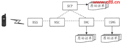 首先,我們了解一下移動(dòng)短消息計(jì)費(fèi)的基本原理。如圖1所示,移動(dòng)短消息的計(jì)費(fèi)是由網(wǎng)絡(luò)中的交換設(shè)備(MSC/SSP、HLR/AC)、智能網(wǎng)業(yè)務(wù)控制點(diǎn)(SCP)、短消息中心(SMC)、短消息互聯(lián)網(wǎng)關(guān)(ISMG)以及相關(guān)計(jì)費(fèi)處理系統(tǒng)等部分相互協(xié)作、共同完成的。