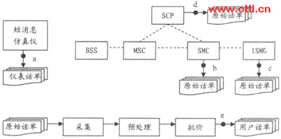通過(guò)對(duì)移動(dòng)點(diǎn)對(duì)點(diǎn)短消息計(jì)費(fèi)原理的分析,可以把整個(gè)計(jì)費(fèi)過(guò)程劃分為兩大環(huán)節(jié):計(jì)費(fèi)點(diǎn)原始話(huà)單的生成和后期計(jì)費(fèi)處理系統(tǒng)的處理。如果其中任何一個(gè)環(huán)節(jié)出現(xiàn)差錯(cuò)都會(huì)降低用戶(hù)計(jì)費(fèi)話(huà)單的準(zhǔn)確性。因此在測(cè)試過(guò)程中采取了用戶(hù)層面和設(shè)備層面相結(jié)合的方法:一方面使用仿真儀表大量模擬點(diǎn)對(duì)點(diǎn)短消息的發(fā)送和接收,得到用戶(hù)話(huà)單;一方面分析各個(gè)計(jì)費(fèi)點(diǎn)生成的原始話(huà)單。