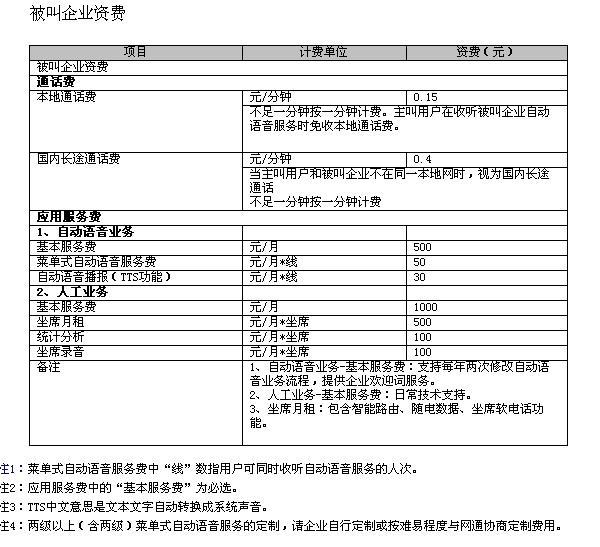 主叫通話費、被叫企業(yè)通話費和應用服務(wù)費按虛擬呼叫中心業(yè)務(wù)資費執(zhí)行。