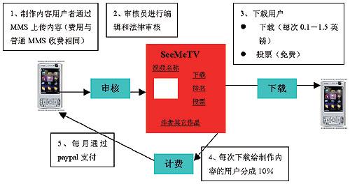 M1新加坡移動運營商M1推出了用戶制作及共享視頻業(yè)務(wù)——MeTV,用戶可以通過MMS上傳視頻內(nèi)容,其它用戶可以瀏覽并下載。這項業(yè)務(wù)為用戶提供了一個展示自己和了解他人的平臺。這個業(yè)務(wù)也建立了與用戶分成的模式,用戶可以從自己上傳的內(nèi)容中獲得利潤。用戶上傳的視頻內(nèi)容,被他人下載一次,用戶就可以獲得0.05新元。自從2007年3月該業(yè)務(wù)推出以來,已經(jīng)有超過4萬名用戶,收入最高的用戶已經(jīng)達到50~100新元。