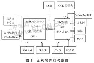 系統(tǒng)硬件主要由TI公司的TMS320DM643和三星公司的S3C2410組成。其中TMS320DM643完成音頻壓縮編解碼G.711/G.729/G.723.1和視頻壓縮編解碼H.264;S3C2410完成SIP協(xié)議和嵌入式OS及各種接口如RS232、復(fù)合視頻輸入/輸出、數(shù)字CCD攝像頭、LCD、RJ45、以太網(wǎng)、鍵盤等。音頻信號(hào)的輸入/輸出通過(guò)TI公司的TLV320AIC23送入TMS320DM643進(jìn)行壓縮編碼。