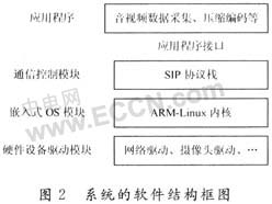 在系統(tǒng)硬件完成后,剩下的需要大量丁作來(lái)編寫代碼實(shí)現(xiàn)各個(gè)功能模塊,最終實(shí)現(xiàn)整個(gè)系統(tǒng)。系統(tǒng)的軟件結(jié)構(gòu)如圖2所示。嵌入式OS是采用ARM-Linux內(nèi)核,硬件驅(qū)動(dòng)模塊主要是基于ARM 9的介于硬件和Linux內(nèi)核之間的軟件接口,為特定的硬件響應(yīng)定義好編程接口從而操作硬件,這2大模塊的技術(shù)目前已相當(dāng)成熟,相關(guān)的文獻(xiàn)非常多;音頻編碼采用G.711/729/723.1,是為了讓終端能適應(yīng)音頻編解碼的非對(duì)稱操作,有良好的兼容性,他可直接選用TI公司第三方提供的語(yǔ)音開發(fā)軟件包。本文根據(jù)視頻電話終端的特點(diǎn)和當(dāng)前實(shí)現(xiàn)的技術(shù)難點(diǎn)主要討論視頻編碼H.264和SIP協(xié)議棧2大核心技術(shù)的硬件實(shí)現(xiàn)。