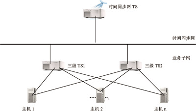 四川電信時間同步網(wǎng)對數(shù)據(jù)網(wǎng)元的授時,統(tǒng)一采用設置三級時間服務器方式。該方式須在數(shù)據(jù)網(wǎng)元內部選定一臺或兩臺機器作為三級TS,三級TS同步到時間同步網(wǎng)的時間服務器,系統(tǒng)內的其他主機與三級TS保持同步,如圖2所示。