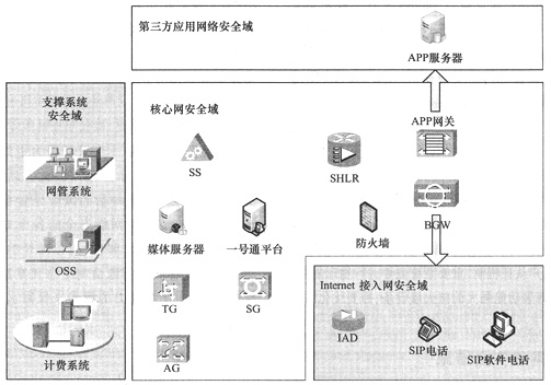 核心網(wǎng)安全域包括所有的軟交換機(jī),TG、AG、SG等接入網(wǎng)關(guān),BGW類設(shè)備,關(guān)鍵業(yè)務(wù)平臺(tái)(包括SHLR、號(hào)碼轉(zhuǎn)換平臺(tái)等),軟交換媒體服務(wù)器和應(yīng)用服務(wù)器,開發(fā)給第三方業(yè)務(wù)接口的應(yīng)用網(wǎng)關(guān)。Internet接入網(wǎng)安全域包括所有分配公網(wǎng)地址的SIP電話終端、IAD類設(shè)備、各類SIP接入的PC等。支撐系統(tǒng)安全域包括網(wǎng)管、計(jì)費(fèi)和OSS等輔助運(yùn)營(yíng)系統(tǒng)。第三方應(yīng)用網(wǎng)絡(luò)安全域主要包括所有以開發(fā)業(yè)務(wù)接口方式接入的應(yīng)用服務(wù)器,鑒于目前實(shí)際應(yīng)用中很少涉及到這種應(yīng)用,這里不討論該區(qū)域的安全需求。