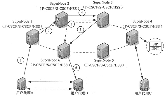 。3)在SuperNode2上,SuperNode2能夠識別會話請求為自己所控制的用戶的會話請求,執(zhí)行S-CSCF功能,完成業(yè)務(wù)的觸發(fā)和控制。在執(zhí)行S-CSCF功能之后,SuperNode3向基于DHT的HSS功能請求被叫用戶的S-CSCF功能所在的位置。