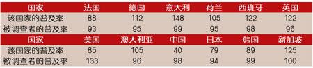 由于所調(diào)查的大多數(shù)是成熟市場(chǎng),因此大多數(shù)國(guó)家的移動(dòng)電話普及率超過75%。其中,普及率超過90%意味著有的用戶可能有幾張SIM卡。