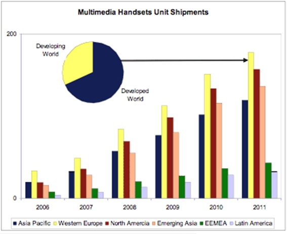 圖2:各地區(qū)的多媒體手機(jī)出貨情況(2006-2011)