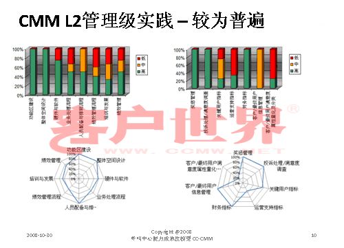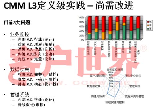接下來我用一個(gè)很小的案例結(jié)束今天的分享,我們整個(gè)的呼叫中心的成熟度模型目前是在電信行業(yè)開始了2008年版的推廣,成熟度模型經(jīng)歷從07年成立亞太呼叫中心產(chǎn)業(yè)聯(lián)盟以后,由一群這個(gè)行業(yè)里面的專家,特別是中國產(chǎn)業(yè)市場的發(fā)展建立起的標(biāo)準(zhǔn),一年以來在通信行業(yè)我們做的能力成熟度的判定有一些很有意思的啟示,通信行業(yè)占到我們整個(gè)呼叫中心產(chǎn)業(yè)約70%的坐席,是最大的、最有代表性的產(chǎn)業(yè)。做下來真的很有代表性,普遍性在于環(huán)境建設(shè)、資產(chǎn)投入、資產(chǎn)配置,所以這下面的雷達(dá)就可以看到,相對完善都是在環(huán)境建設(shè),功能區(qū)建設(shè),整體空間設(shè)計(jì)、硬件相對來說比較偏硬的一些。在其他方面偏廢的比較厲害。第二個(gè)雷達(dá)在一些獎(jiǎng)懲管理、信息管理,整個(gè)軟性方面幾乎有很濃重的一些計(jì)劃經(jīng)濟(jì),制造行業(yè)的一些領(lǐng)域相對來說比較成熟。我們目前看到的,基本上通信行業(yè)的一些發(fā)展在能力成熟度上是二級到四級,尤其以二到三級的發(fā)展更為普遍。通常的方法為期一周的標(biāo)桿調(diào)研,看所有的呼叫中心發(fā)展的五個(gè)方面,我們才會在里面做這樣的判定。在能力成熟度的三級,我們做了一些企業(yè)發(fā)現(xiàn),特別在三級,關(guān)于能不能對流程進(jìn)行一致性管理方面,就是剛才李老師講到的不是最急的,而管理是最重要的。可能所有的流程多多少少有一些成熟度的問題,但是我們的源頭流程能力在三個(gè)方面有很大的差距:一個(gè)是業(yè)務(wù)監(jiān)控流程,第二個(gè)數(shù)據(jù)收集流程,還有一個(gè)是管理系統(tǒng)的審核流程。這個(gè)大家可以和自己的呼叫中心比一比。
