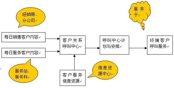 呼叫中心的回訪呼叫工作、咨詢服務(wù)呼叫和問題投訴呼叫需要掌握大量的客戶信息資源和公司的產(chǎn)品與服務(wù)政策信息,而這方面的信息需要由客戶購車過程、維修過程和公司內(nèi)部的相關(guān)部門提供。