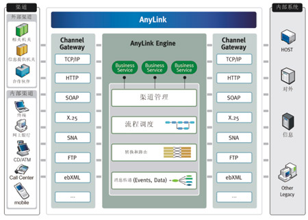 通過基于AnyLink的電子渠道統(tǒng)一接口平臺解決方案提供各類網(wǎng)關(guān)功能,可實現(xiàn)各種系統(tǒng)的整合,還提供報文轉(zhuǎn)換及路由的中介功能、管理和監(jiān)控所需的GUI工具,實現(xiàn)系統(tǒng)運營和維護及開發(fā)的最佳化(如圖所示)。