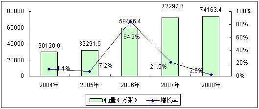 圖2 2004-2008年中國移動(dòng)通信卡市場規(guī)模與增長(按銷量)
