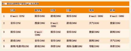 根據(jù)尼爾森2008年一季度的研究結(jié)果,移動(dòng)互聯(lián)網(wǎng)用戶使用的業(yè)務(wù)集中于五大類,歐美地區(qū)用戶使用習(xí)慣比較接近,而中國(guó)用戶與歐美用戶存在較大差異。具體見(jiàn)表1。