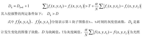 本設(shè)計中采集的是灰度圖像,為了實現(xiàn)入侵掃描功能,要求能夠存儲兩場圖像?紤]到檢測實時性要求,采用基于幀間差分的變化檢測。檢測運動目標時,考慮到對目標大小的選擇性以及為了克服光照變化引起的虛警報, 在幀間差分基礎(chǔ)上,引入圖像塊概念,將圖像分成M個n×n的子塊,判斷每一子塊圖像是否發(fā)生變化,統(tǒng)計發(fā)生變化的子塊數(shù)目,判斷式為: