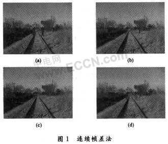 綜合考慮以上四種背景提取方法,本文采用結(jié)合多幀圖像平均法和連續(xù)幀差法這兩種方法來進(jìn)行視頻序列背景的提取?紤]到運(yùn)動目標(biāo)的多樣性,有目標(biāo)經(jīng)過視場而引起的變化長時間內(nèi)可忽略不計。多幀圖像平均法時將運(yùn)動目標(biāo)看作為噪聲,用累加平均的方法消除噪聲,利用目標(biāo)運(yùn)行一段時間的序列圖像進(jìn)行平均而得到視場背景圖像。連續(xù)幀差算法是通過當(dāng)前幀的圖像與前一幀圖像的差值找到運(yùn)動區(qū)域,對運(yùn)動區(qū)域的背景保持不變,而非運(yùn)動區(qū)域的背景則用當(dāng)前幀進(jìn)行更新,經(jīng)過一段時間的迭代便可提取出背景。兩種方法的結(jié)合可以很好地彌補(bǔ)各自的缺點,能夠適應(yīng)鐵路沿線周邊環(huán)境的要求,對存在運(yùn)動目標(biāo)的背景能夠提取出質(zhì)量較高的背景圖像。具體過程如下: