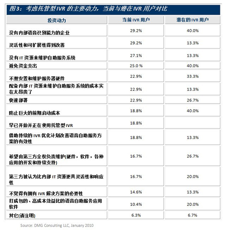 圖3顯示了現(xiàn)有和潛在的語音自助服務(wù)用戶尋求托管型IVR的主要動力來源。潛在客戶認(rèn)真考慮托管型IVR解決方案的兩個很明顯的原因是避免大的資金開銷和最小化啟動成本,在經(jīng)濟(jì)不景氣時這樣的做法并不令人意外。另外還有個原因是希望一邊使用該方案一邊積累經(jīng)驗(yàn)和知識。