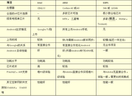 這三種處理器架構(gòu)各有優(yōu)缺點(diǎn),都希望成為未來(lái)Android互聯(lián)網(wǎng)電視(如果成功的話(huà))的最主流平臺(tái)。那么哪一個(gè)處理器將最終勝出呢,答案只有留給時(shí)間來(lái)揭曉,我們不妨先來(lái)對(duì)這三個(gè)架構(gòu)進(jìn)行一番比較: