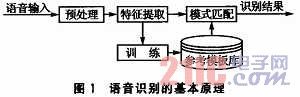 語音識別的基本原理如圖1所示。語音識別包括兩個階段:訓(xùn)練和識別。不管是訓(xùn)練還是識別,都必須對輸入語音預(yù)處理和特征提取。訓(xùn)練階段所做的具體工作是通過用戶輸入若干次訓(xùn)練語音,經(jīng)過預(yù)處理和特征提取后得到特征矢量參數(shù),最后通過特征建模達到建立訓(xùn)練語音的參考模型庫的目的。而識別階段所做的主要工作是將輸入語音的特征矢量參數(shù)和參考模型庫中的參考模型進行相似性度量比較,然后把相似性最高的輸入特征矢量作為識別結(jié)果輸出。這樣,最終就達到了語音識別的目的。