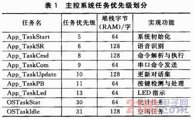 表1中除OSTaskStat和OSTaskIdle任務(wù)為系統(tǒng)自帶,其他7個任務(wù)均為用戶創(chuàng)建。App_TaskStart是系統(tǒng)的第一個任務(wù),對系統(tǒng)時鐘和底層設(shè)備進行初始化,創(chuàng)建所有事件和其他各項用戶任務(wù),并對系統(tǒng)狀態(tài)進行監(jiān)測;App_TaskSR完成語音識別;App_TaskCmd完成對話集中命令的解析和執(zhí)行,并通過USART1向外發(fā)送;App_TaskCom作為外圍擴展任務(wù),通過USART2向外發(fā)送指令或數(shù)據(jù),負(fù)責(zé)控制外圍擴展設(shè)備,如語音合成設(shè)備等;