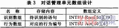 為了方便進行對話的管理,本文中設(shè)計了一個對話管理單元,用于對等待識別的語句和等待執(zhí)行的命令進行存儲,在主控制器中通過定義二維數(shù)組來實現(xiàn)。LD3320每次識別最多可以設(shè)置50項候選識別句,每個識別句可以是單字、詞組或短句,長度為不超過10個漢字或者79個字節(jié)的拼音串。基于上述原因,本文設(shè)計的對話管理數(shù)組如表3所列。