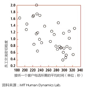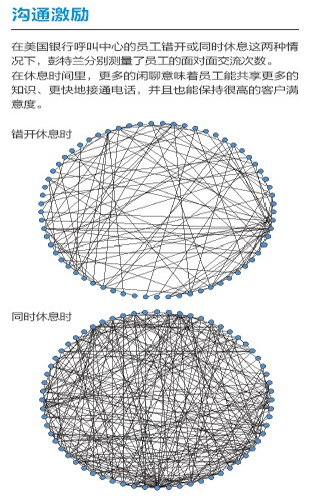去年,彭特蘭的實驗室與美國銀行(Bank of America)設(shè)在羅得島(Rhode Island)的呼叫中心合作,在80 名中心員工身上安裝了社會傳感器。這種傳感器看起來像一枚不顯眼的徽章,使用藍(lán)牙和紅外信號監(jiān)測實驗對象每分鐘與哪些同事交談。測試活動先開展了一個月,后來又進(jìn)行了6周。第一個月后,實驗室的研究人員發(fā)現(xiàn),與更多同事進(jìn)行過交談的員工能夠更快地接通電話,他們自我感覺的壓力也相對較小,而客戶滿意度卻與其他人一樣高。與刻板地遵循員工手冊或服從經(jīng)理的電子郵件指示相比,通過非正式的閑聊來交流問題和解決方案似乎能取得更好的結(jié)果。有了這種結(jié)論之后,該呼叫中心嘗試盡量將員工的休息時間安排在一起,而非像過去那樣錯開。這樣員工就有了更多的時間參與閑聊。幾個月后,美國銀行向?qū)嶒炇覉蟾媪私Y(jié)果:該呼叫中心獲得了相當(dāng)于每年1,500 萬美元的生產(chǎn)力提升。