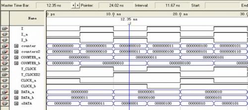 使用的信號(hào)包括:數(shù)據(jù)信號(hào)data_a,dat_b;讀寫(xiě)有效信號(hào)wren_a,wren_b;地址信號(hào)address_a,address_b;時(shí)鐘信號(hào)clock_a,clock_b;輸出數(shù)據(jù)信號(hào)q_a,q_b?梢钥吹剿械男盘(hào)都是成對(duì)出現(xiàn)的,就是為了進(jìn)行乒乓方式的數(shù)據(jù)傳輸。分成了兩個(gè)RAM區(qū)域,A和B,相當(dāng)于前面講乒乓方式里的數(shù)據(jù)緩沖模塊1和2。兩個(gè)RAM塊是交替著讀寫(xiě)(由I_a和I_b決定),輸出數(shù)據(jù)流也是由I決定。剛說(shuō)到寫(xiě)時(shí)鐘是13.5M,讀時(shí)鐘是27M,所以clock_a和clock_b必須是讀寫(xiě)時(shí)鐘切換著輸入,而且地址的計(jì)數(shù)也不一樣,寫(xiě)周期時(shí)候地址增加的時(shí)鐘是13.5M,讀周期地址增加的時(shí)鐘是27M。所以每行的數(shù)據(jù)讀了兩遍,相當(dāng)于隔行變逐行。圖6在Qartus II下RAM的乒乓操作功能仿真圖: