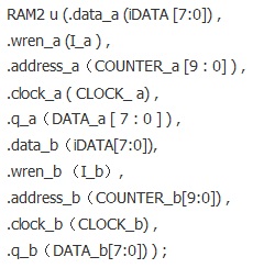 方法2 可以這樣實(shí)現(xiàn):在FPGA內(nèi)部使用Megacore,構(gòu)造一個(gè)雙口的RAM,雙口RAM的輸入輸出信號(hào)的硬件描述語(yǔ)言定義如下: