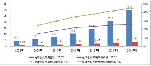 根據(jù)Wainhouse Research的調(diào)研數(shù)據(jù),我國(guó)電話會(huì)議的主要市場(chǎng)參與者為運(yùn)營(yíng)商,2009年,中國(guó)電話會(huì)議營(yíng)收達(dá)6億元。保守預(yù)計(jì),未來(lái)幾年,電話會(huì)議服務(wù)的銷售收入將以高出30%以上的速度增長(zhǎng),2014年,市場(chǎng)規(guī)模達(dá)到29.9億元。