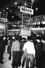 韓國移動通信運(yùn)營商SK電訊的展臺是整個展會上最熱鬧的地方之一,能歌善舞的韓國藝人吸引了很多觀眾駐足。在“為人類的移動互聯(lián)通信, SK電訊與您攜手”的主題下,SK電訊展示了移動增值及移動互聯(lián)服務(wù)。