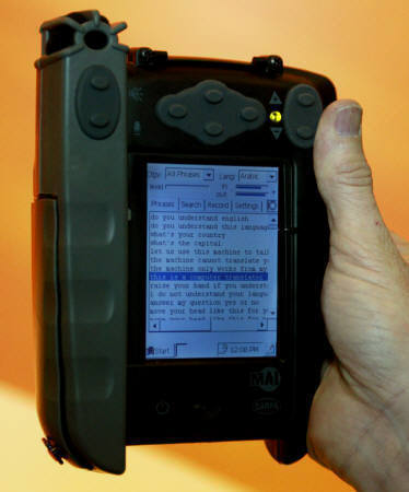 這款Marine Acoustics于2003年4月22日在舊金山的嵌入式系統(tǒng)會(huì)議(Embedded Systems Conference)上展示的新型語言翻譯機(jī),采用微軟CE系統(tǒng),可讓使用者對(duì)著機(jī)器說話,再將整句話翻成別國(guó)語言發(fā)聲,可做為隨身攜帶的移動(dòng)翻譯機(jī)。目前美國(guó)軍方已采用數(shù)百部,配備給派駐在阿富汗以及伊拉克的美軍使用。