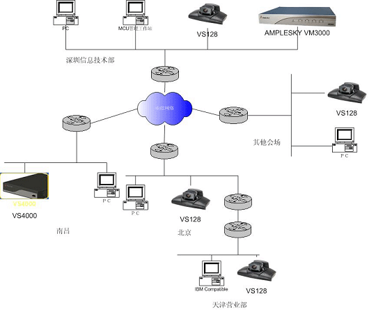 整個(gè)系統(tǒng)構(gòu)建在江南證券有限責(zé)任公司廣域網(wǎng)上,江南證券有限責(zé)任公司廣域網(wǎng)骨干帶寬為512K,江南證券有限責(zé)任公司視頻會(huì)議系統(tǒng)可以使用足夠的帶寬。江南證券有限責(zé)任公司視頻會(huì)議系統(tǒng)拓?fù)鋱D結(jié)構(gòu)如下: