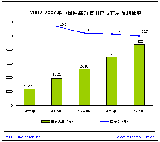 上海艾瑞市場(chǎng)咨詢(xún)有限公司是一家專(zhuān)注于網(wǎng)絡(luò)媒體、網(wǎng)絡(luò)營(yíng)銷(xiāo)等網(wǎng)絡(luò)經(jīng)濟(jì)領(lǐng)域的專(zhuān)業(yè)市場(chǎng)調(diào)研機(jī)構(gòu)。公司近期發(fā)布《2003年中國(guó)網(wǎng)絡(luò)短信研究報(bào)告》,該報(bào)告中根據(jù)中國(guó)的網(wǎng)絡(luò)經(jīng)濟(jì)發(fā)展情況預(yù)測(cè):2003年中國(guó)網(wǎng)絡(luò)短信用戶(hù)將達(dá)到1925萬(wàn),2004年將達(dá)到2640萬(wàn)。